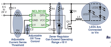 該驅(qū)動(dòng)器控制器開(kāi)關(guān)頻率高達(dá)700kHz,不需要輸出電容,Vcc工作范圍從6.35至18 V,可驅(qū)動(dòng)一個(gè)或多個(gè)大功率LED,主要用在MR16 LED照明、環(huán)境燈照明、太陽(yáng)能LED、交通照明、室外照明和LED光條等應(yīng)用。采用NCL30100的PCB非常小巧,可以裝入MR16燈的燈座內(nèi)。NCL30160的遲滯控制特性可在負(fù)載瞬期間提供快速的響應(yīng),無(wú)需小型信號(hào)控制環(huán)路補(bǔ)償元件。保護(hù)特性包括可利用電阻設(shè)定LED電流、LED短路保護(hù)、欠壓鎖定及熱關(guān)閉。