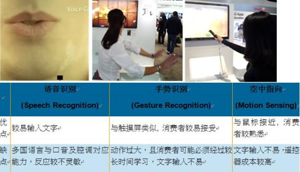 目前在許多電視機(jī)廠商與電視品牌的努力之下,已經(jīng)出現(xiàn)了三個(gè)通用的人機(jī)界面解決方案:語音識(shí)別 (Speech Recognition),手勢(shì)識(shí)別 (Gesture Recognition)和動(dòng)作感應(yīng) (Motion Sensing)。每種方式均有其優(yōu)點(diǎn)和缺點(diǎn),簡(jiǎn)單分列如下。