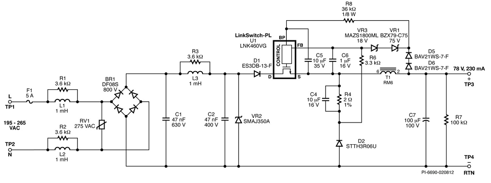 注意:本設(shè)計(jì)利用DER-305 PCB板制作,最大限度地利用了LNK460VG器件散熱器的面積。