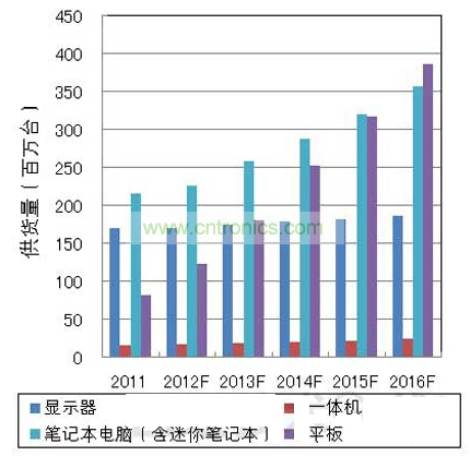 未來的市場動向方面,筆記本電腦市場的年增長率有望達到10~15%左右,平板電腦市場將憑借低價格和輕便、應(yīng)用程序與智能手機的通用性,繼續(xù)保持大約30~40%的增長率,到2016年,平板電腦的供貨量預計將超過筆記本電腦(圖1)。