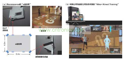 (a)是Renaissance經(jīng)營的健身俱樂部設(shè)置的“e運(yùn)動場”。使用投影儀把游戲畫面投影投影到訓(xùn)練館中,用戶親身參與其中。人體動作使用距離圖像傳感器獲取。照片上是2位運(yùn)動員相對而立,向?qū)Ψ角蜷T射出虛擬球的“空氣曲棍球”游戲。(b)是耐克公司與微軟公司合作為“Xbox 330”開發(fā),支持Kinect的健身軟件“Nike+Kinect Training”的畫面示例。該軟件將檢測身體的動作,為目標(biāo)提供有效訓(xùn)練方式。