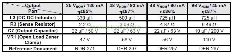 本文介紹采用PI LinkSwitch-PL系列非隔離單級(jí)LED驅(qū)動(dòng)器IC設(shè)計(jì)而成的針對(duì)B10型LED燈泡設(shè)計(jì)的高效率、超緊湊驅(qū)動(dòng)器——DER-297。它的單一恒流輸出功率為4.5W,可輕松配置從35V到100V的輸出電壓,如下表所示。