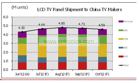 圖一、Jun’12 – Oct’12出貨至中國本土廠商電視面板數(shù)量趨勢(shì)分析