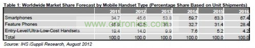 今年智能手機出貨與與市場份額強勁擴張,將首次成為領(lǐng)先的手機類型,而且未來幾年出貨量將保持兩位數(shù)的增長速度。到2016年,智能手機將占總體手機市場的67.4%,如表1所示。