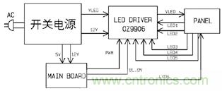電視顯示系統(tǒng)包括電源板、主板、背光驅(qū)動(dòng)板等, 電源板提供VLED、12V給背光板,主板提供背光控制信號(hào)BL_ON和調(diào)光PWM信號(hào)給背光板。背光驅(qū)動(dòng)ICOZ9906 檢測(cè)PANEL內(nèi)部五條燈條的流過(guò)的電流,進(jìn)行定電流和電流平衡控制,點(diǎn)亮背光系統(tǒng)。