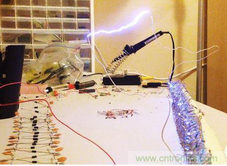 火花間隙可用彎曲的電阻和電容連接各級組成,不過你需要時刻關注這過程,通常用螺絲刀操作觸發(fā)第一個火花間隙更有效,這樣可使后續(xù)各級火花更完美。