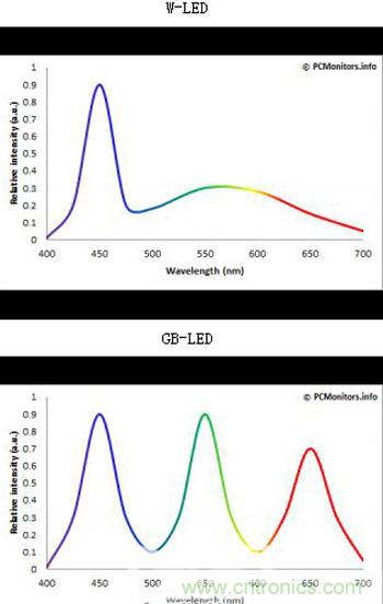 不管是投影儀還是電視機(jī)都采用的是RGB-LED光源,也就是紅黃藍(lán)三色LED光源,而這3種顏色的LED,以“藍(lán)光LED”最為重要,減弱藍(lán)光則會(huì)使色彩失真,整體畫(huà)面色調(diào)偏紅黃。一起看看LED顯示器兩種主要發(fā)光模塊W-LED(常用)和GB-LED的光譜組成。如下圖: