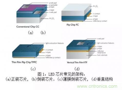 基于氮化鎵的藍(lán)/白光LED的芯片結(jié)構(gòu)強(qiáng)烈依賴于所用的襯底材料。目前大部分廠商采用藍(lán)寶石作為襯底材料,芯片結(jié)構(gòu)主要分為4類,如圖1所示: