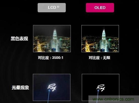 OLED電視由于顯示原理的不同,在畫(huà)質(zhì)方面相較LCD液晶電視的優(yōu)勢(shì)還體現(xiàn)在它的對(duì)比度上,因?yàn)镺LED的所有像素都是自發(fā)光,所以理論上對(duì)比度是無(wú)限的,因而可以呈現(xiàn)完美的黑色顯示;而LCD電視無(wú)法完全遮擋背光源的光線,不可避免出現(xiàn)漏光和光暈現(xiàn)象,并且大部分傳統(tǒng)的LCD電視對(duì)比度不到5000:1,播放純黑畫(huà)面時(shí)則呈現(xiàn)為深灰色。