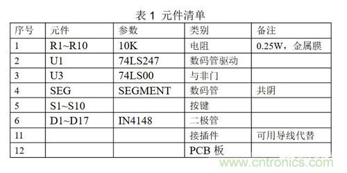 如圖1所示,電路由與非門74LS00、數(shù)碼管驅(qū)動芯片74LS247組成。10個按鍵組成輸入電路,經(jīng)過與非門電路編碼后,輸入數(shù)碼管驅(qū)動芯片,驅(qū)動數(shù)碼管顯示相應(yīng)的按鍵號。