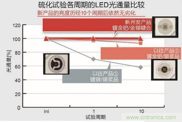 通過對比得出ROHM新產(chǎn)品的優(yōu)勢:一是能保持亮度,二保護芯片鍵合材料不受損壞,三無需其他保護對策。