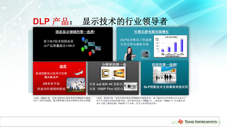 “在顯示應(yīng)用領(lǐng)域,DLP技術(shù)涵蓋范圍非常廣,從小巧的口袋型顯示器到高端大型的數(shù)字影院,TI一直保持大量的產(chǎn)品和技術(shù)創(chuàng)新。”Ane Sacks女士在會(huì)議中介紹到,“如今,TI已經(jīng)能夠?qū)崿F(xiàn)最高幀速率和最高亮度的快速投影顯示技術(shù),面向快速動(dòng)作視頻和游戲市場(chǎng);在面板分辨率上推出了入門級(jí)的4K平臺(tái),與此同時(shí)在1080P上也有十足的創(chuàng)新,推出了超高性價(jià)比的1080p Pico解決方案,未來(lái)市場(chǎng)潛力巨大。”
