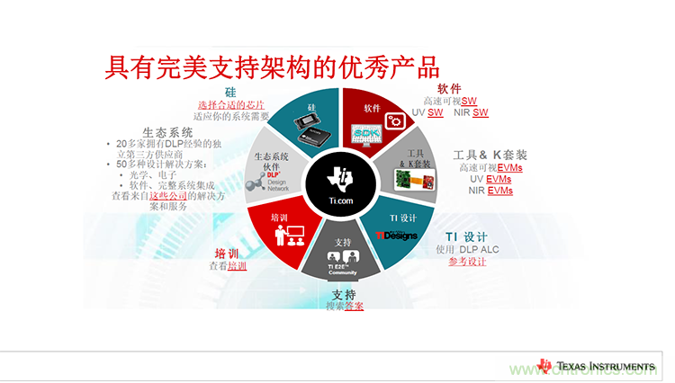 “為加速滲透民用主流市場(chǎng),TI不僅推出了性能優(yōu)異的產(chǎn)品,還建立了一流的支持架構(gòu),以借助廣大TI用戶加快產(chǎn)品面市。”Ane Sacks女士還表示,“針對(duì)TI的IC和DLP芯片組,TI可以提供軟件、工具套件、參考設(shè)計(jì)、工程社區(qū)交流、技術(shù)培訓(xùn)以及完善的DLP生態(tài)系統(tǒng)等技術(shù)支持,包含20多家擁有DLP經(jīng)驗(yàn)的獨(dú)立第三方供應(yīng)商以及50多種光學(xué)、電子、軟件等方面的設(shè)計(jì)解決方案,能夠?qū)⒆钚碌膭?chuàng)新、產(chǎn)品和應(yīng)用及時(shí)、快速地傳遞給客戶。”