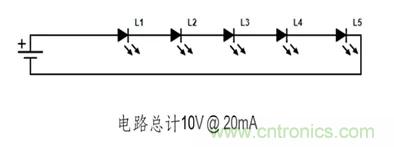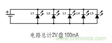 【導讀】LED電路的接線方式?jīng)Q定了電路正常工作所需的電壓和電流。下方兩條電路使用了五個160-1445-1-ND LED。單個LED電壓2V 20mA。如您所見, 每條電路所需的工作電壓和電流之間存在顯著差異。