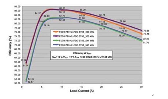 注意上面的兩條曲線,在滿載(30A)時,可以看到最新的器件的效率有1.5%的改進。同樣還是這兩條曲線,在負荷較?。?5A)時,可以實現(xiàn)0.69%的改善。如果對整個負荷范圍積分,那么與今天常見的方案相比,使用最新的MOSFET器件時平均功率損耗可以降低8%~10%。即使在較高的開關頻率541kHz處,可以看到在負荷小時系統(tǒng)級效率仍然高于80%,而在滿載時效率大于70%。如果頻率繼續(xù)增加,那么開關損耗將急劇增加。
