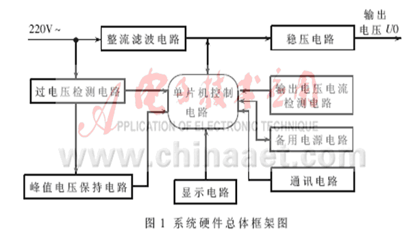 系統(tǒng)硬件框架如圖1所示。在正常的情況下,220V的交流輸入電壓經(jīng)過整流、濾波、DC/DC變換、穩(wěn)壓電路后可得到一個(gè)穩(wěn)定的輸出電壓,基本上是一個(gè)開關(guān)電源;當(dāng)有過電壓時(shí),過電壓信號(hào)經(jīng)過過電壓檢測(cè)電路檢測(cè)和峰值電壓保持電路保持,控制電源回路,斷開正常工作的交流電路,同時(shí)通過計(jì)算機(jī)啟動(dòng)備用電源工作,以及完成對(duì)過電壓的瞬時(shí)值和峰值的測(cè)量。