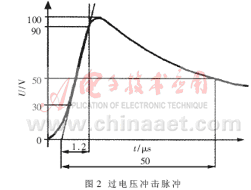 過電壓對(duì)于電源來說是一個(gè)非常有害的信號(hào),雷電等引起的瞬時(shí)高電壓如果不加遏制,直接由電源引入RTU(遠(yuǎn)程終端設(shè)備)則會(huì)影響其電源模塊的正常工作,使各功能模塊的工作電壓升高而工作不正常,嚴(yán)重時(shí)會(huì)損壞模塊,燒壞元器件(IC)。典型過電壓形成的沖擊電壓脈沖如圖2所示。