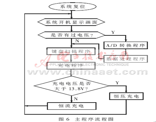主程序由初始化、看門狗置位、鍵盤掃描子程序、中斷子程序組成。主程序主要進(jìn)行分配內(nèi)存單元、設(shè)置串行口等器件的工作方式和參數(shù),為系統(tǒng)正常工作創(chuàng)造條件。在主程序運(yùn)行的過程中,通過按鍵可以顯示檢測(cè)的各個(gè)量的值;同時(shí)在系統(tǒng)有過電壓和干擾信號(hào)產(chǎn)生時(shí),液晶顯示屏?xí)@示提示信息,使電源實(shí)現(xiàn)“透明”,便于電源的管理。在本系統(tǒng)中,鍵盤采用的是由P1口組成的3×3行列矩陣式鍵盤。由于鍵盤程序的技術(shù)已經(jīng)相當(dāng)成熟,所以具體過程不做介紹。