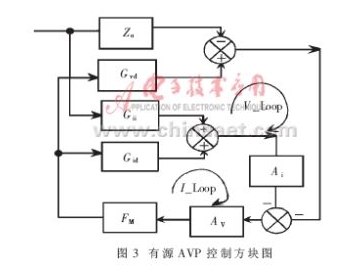 AVP有源控制為雙環(huán)控制,其基本原理如圖2所示。通過檢測電感電流,根據(jù)降壓要求相應(yīng)調(diào)節(jié)輸出電壓的基準(zhǔn)。輸出電壓跟隨基準(zhǔn)電壓而實(shí)現(xiàn)AVP控制。圖3為AVP有源控制的方塊圖,假設(shè)電流環(huán)增益為Ti,電壓環(huán)增益為Tv,則: