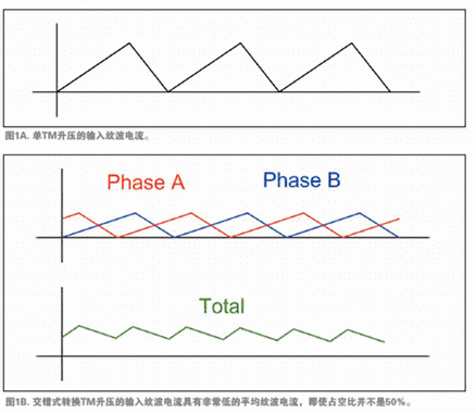 為了生產(chǎn)的更薄、高效而廉價(jià)的電源,近來(lái)開(kāi)發(fā)了UCC28060,在單一設(shè)備中采用兩個(gè)交錯(cuò)式轉(zhuǎn)換通道TM PFC的集成電路。UCC28060充分發(fā)揮了TM的全部?jī)?yōu)勢(shì),并利用交錯(cuò)式轉(zhuǎn)換的優(yōu)勢(shì)來(lái)彌補(bǔ)TM的缺點(diǎn)。例如,如圖1A與1B所示,交錯(cuò)式轉(zhuǎn)換降低了輸入紋波電流,所以可以使用小得多的EMI濾波器。交錯(cuò)式轉(zhuǎn)換還降低了輸出波紋,可使用較小的輸出電容,并能延長(zhǎng)電容壽命。交錯(cuò)式轉(zhuǎn)換還可將一個(gè)大電感分成兩個(gè)較小的電感,提高了功率級(jí)別并實(shí)現(xiàn)了超薄的封裝。