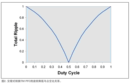如果交錯(cuò)式轉(zhuǎn)換電源轉(zhuǎn)換器以50%的占空比工作,第一相的輸入波紋完全抑制了第二相的輸入波紋,從而產(chǎn)生無(wú)開(kāi)關(guān)成分的輸入電流,且不會(huì)產(chǎn)生EMI。在占空比偏離50%時(shí),抑制作用降低,殘余波紋增大(參見(jiàn)圖2)。然而,波紋抑制多數(shù)的優(yōu)點(diǎn)還是實(shí)現(xiàn)了。