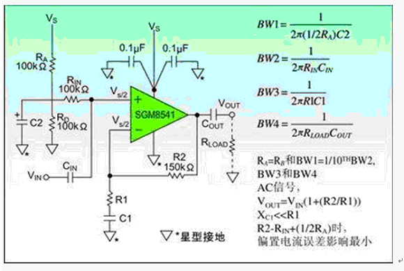 首先,電路的電源抑制幾乎沒有,電源電壓的任何變化都將直接通過兩個(gè)分壓電阻改變偏置電壓Vs/2,但電源抑制的能力是電路非常重要的特性。例如此電路的電源電壓1伏的變化,能引起偏置電路電壓的輸出Vs/2變化0.5伏。該電路的電源抑制僅僅只有6dB,通過選用SGM8541運(yùn)算放大器可以增強(qiáng)電源抑制能力。