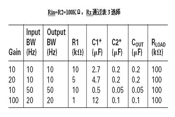 設(shè)計(jì)單電源運(yùn)算放大器電路,需要考慮輸入偏置電流誤差、電源抑制、增益、以及輸入與輸出線路帶寬等等。然而普通的應(yīng)用設(shè)計(jì)是可以通過查表來(lái)獲得,見表1。在單電源電壓為15V或12V時(shí)偏置分壓的兩個(gè)電阻通常選用100kΩ,這樣可以在電源消耗與輸入偏置電流誤差之間合理的折中。5V單電源偏置分壓電阻減小到一個(gè)比較低的值,例如42kΩ。還有些在3.3V應(yīng)用中偏置分壓電阻選在27kΩ左右。
