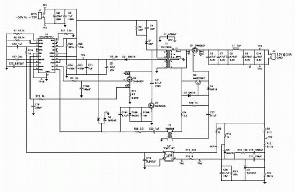 圖 3 顯示了傳統(tǒng)同步反向電源設(shè)計的完整原理圖。該設(shè)計使用了一個低成本、簡化的電流模式 PWM 控制器(即 UCC2809),對電源進行控制。除了主緩沖器以外,該電路還需要D3 和 D4 的齊納鉗位電路,以防止來自漏極電感峰值的 Q1 超高柵-源電壓。