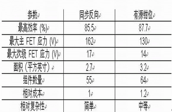 表 2 列出了對兩種同步反向電源主要部分進行比較的總結(jié)。該表說明了有源鉗位反向電源相對于變壓器驅(qū)動同步反向電源在性能上的優(yōu)勢。尤其是在輕負載情況下,有源鉗位反向電源具有更低的 FET 電壓應(yīng)力及更高的效率。有源鉗位控制器 (UCC2897) 的可編程停滯時間特性(該特性可防止主、次級 FET 的疊加傳導(dǎo) (overlapping conduction))有助于最小化 Q1 二次側(cè)直通損耗。這些損耗一般表現(xiàn)為可在主電流感應(yīng)電阻器上觀測到的一個大電流峰值,且經(jīng)常會導(dǎo)致輕負載抖動的問題。有源鉗位反向電源較低的高頻振鈴會產(chǎn)生更少的 EMI 及一個全局范圍內(nèi)更低噪聲的電源。由于漏極電感對有源鉗位電路性能的影響較小,因此,盡管同步反向電源并不是一無是處,但比起帶有同步反向的情況,高頻操作更有可能實現(xiàn)。在這兩個示例電路中,與有源鉗位反向電源相比,傳統(tǒng)的同步反向電源可將 PWB 面積、組件數(shù)量和成本上降低大約 15%~20%。這是一款容易設(shè)計和(可論證性地)理解的更簡單的電路,雖然如此,但還是要考慮到其在性能上的一些不足。那么,您應(yīng)該在什么時候選擇一個有源鉗位反向電源呢?如果輸出功率較低,同時設(shè)計要求一直進行連續(xù)模式運行,那么有源鉗位反向電源可以實現(xiàn)高效率、低 EMI 運行。在輕負載效率較為關(guān)鍵的應(yīng)用中,它具有一個更為明顯的優(yōu)勢。