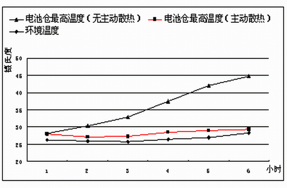 因此戶外電源設計中針對電池倉的環(huán)境控制非常關鍵。尤其在高溫環(huán)境中要有針對性的散熱措施,研究表明,傳統(tǒng)的自然開孔散熱難以滿足電池的應用要求。在傳統(tǒng)的自然開孔散熱條件下,雖然蓄電池自身發(fā)熱量較小,但隨著環(huán)境溫度的升高,在蓄電池倉中的熱累積會逐步的升高電池倉的溫度,在太陽照射的條件下情況更為嚴重。如圖6所示,在自然散熱條件下(倉內無主動散熱措施),電池倉內溫度會遠高于環(huán)境溫度。在同樣的條件下,采用主動散熱技術,電池倉內溫度基本接近于環(huán)境溫度,電池工作條件會得到極大改善。根據(jù)此項研究結果,艾默生開發(fā)了電池倉獨立風道散熱技術,保證了電池倉的充分散熱,極大的改善了電池工作溫度,提高了電池壽命。