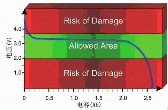 一旦電壓超出允許范圍,鋰電池很容易被損壞(見圖1)。如果超出電壓的上限和下限(例如,nanophosphate鋰電池的電壓上限和下限分別為3.6V和2V),電池就可能會(huì)受到不可逆的損壞,至少也會(huì)增加電池的自放電率。在相當(dāng)寬的荷電狀態(tài)范圍內(nèi),輸出電壓可以保持穩(wěn)定,因此正常情況下超出安全范圍的可能性比較小。但是,在接近安全范圍上限和下限的區(qū)域,變化曲線非常陡峭。作為預(yù)防措施,仔細(xì)監(jiān)測(cè)電壓水平非常必要。