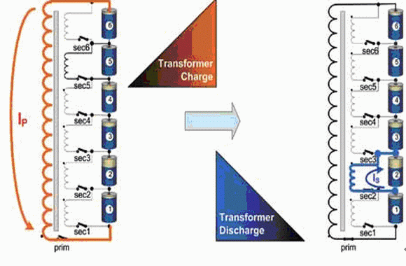 閉合主繞組開關(guān),電池組向變壓器充電。然后斷開主繞組開關(guān),閉合相應(yīng)的次繞組開關(guān)(本例中為2號(hào)次繞組開關(guān)),變壓器儲(chǔ)存的能量轉(zhuǎn)移到指定的電池上。