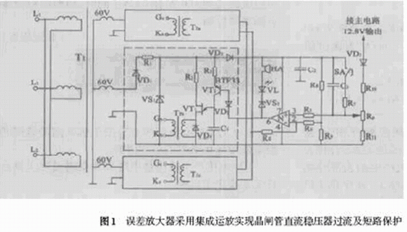 盡管功率場(chǎng)效應(yīng)VDMOS 和絕緣柵雙極型晶體管IGBT等電力半導(dǎo)體元器件層出不窮,且在電力電子技術(shù)領(lǐng)域占據(jù)重要位置,晶閘管(可控硅) 卻因耐高壓耐大電流沖擊的特性,仍有著穩(wěn)固的陣地,受到用戶的青睞。在擯棄電流采樣、放大和執(zhí)行等多個(gè)環(huán)節(jié)的情況下,將單結(jié)晶體管移相觸發(fā)器中的晶體管誤差放大器改為集成運(yùn)算放大器,就可實(shí)現(xiàn)晶閘管直流穩(wěn)壓器的過(guò)流及短路保護(hù),簡(jiǎn)化了電路結(jié)構(gòu),并提高了整機(jī)的穩(wěn)定可靠性能和AC - DC變換效率。