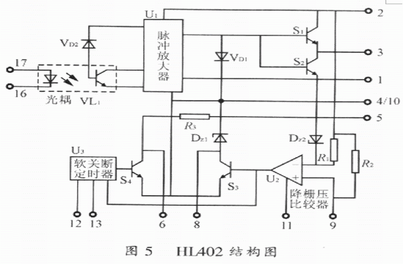 HL402結(jié)構(gòu)圖如圖5所示。圖5中,VL1為帶靜電屏蔽的光耦合器,它用來實(shí)現(xiàn)與輸入信號(hào)的隔離。由于它具有靜電屏蔽,因而顯著提高了HL402抗共模干擾的能力。圖5中U1為脈沖放大器,S1、S2實(shí)現(xiàn)驅(qū)動(dòng)脈沖功率放大,U2為降柵壓比較器,正常情況下由于腳9輸入的IGBT集電極電壓VCE不高于U2的基準(zhǔn)電壓VREF,U2不翻轉(zhuǎn),S3不導(dǎo)通,故從腳17和腳16輸入的驅(qū)動(dòng)脈沖信號(hào)經(jīng)S2整形后不被封鎖。該驅(qū)動(dòng)脈沖經(jīng)S2、S2放大后提供給IGBT使其導(dǎo)通或關(guān)斷,一旦IGBT退飽和,則腳9輸入集電極電壓給IGBT使其導(dǎo)通或關(guān)斷,并且腳9輸入的集電極電壓采樣信號(hào)VCE高于U2的基準(zhǔn)電壓VREF,比較器U2翻轉(zhuǎn)輸出高電平,使S3導(dǎo)通,由穩(wěn)壓管DZ2將驅(qū)動(dòng)器輸出的柵極電壓VGE降低到10V。此時(shí),軟關(guān)斷定時(shí)器U3在降柵壓比較器U2翻轉(zhuǎn)達(dá)到設(shè)定的時(shí)間后,輸出正電壓使S4導(dǎo)通,將柵極電壓軟關(guān)斷降到IGBT的柵射極門限電壓,給IGBT提供一個(gè)負(fù)的驅(qū)動(dòng)電壓,保證IGBT可靠關(guān)斷。