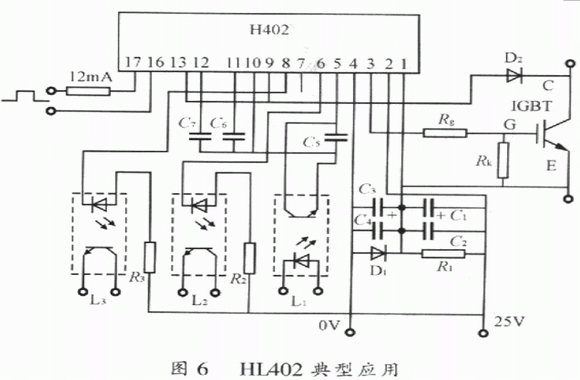 HL402是17腳單列直插式結(jié)構(gòu),內(nèi)置有靜電屏蔽層的高速光耦合器實(shí)現(xiàn)信號(hào)隔離,抗干擾能力強(qiáng),響應(yīng)速度快,隔離電壓高。它具有對(duì)IGBT進(jìn)行降柵壓、軟關(guān)斷雙重保護(hù)功能,在軟關(guān)斷及降柵壓的同時(shí)能輸出報(bào)警信號(hào),實(shí)現(xiàn)封鎖脈沖或分?jǐn)嘀骰芈返谋Wo(hù)。它輸出驅(qū)動(dòng)電壓幅值高,正向驅(qū)動(dòng)電壓可達(dá)15~17V,負(fù)向偏置電壓可達(dá)10~12V,因而可用來直接驅(qū)動(dòng)容量為400A/600V及300A/1200V以下的IGBT。