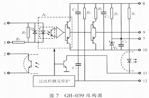 其內(nèi)部結(jié)構(gòu)圖如圖7所示,工作原理與EXB和M57系列模塊相類似,這里不再贅述。而與EXB系列和M57系列的模塊不同的是該模塊已含有保護(hù)后發(fā)送報(bào)警或動(dòng)作信號(hào)的光耦合器,所以使用中不需要像EXB和M57系列的模塊外接光耦合器,因而更加方便,其性能比EXB和M57系列的模塊在保護(hù)性能上更加優(yōu)越;在可靠性方面,由于GH-039是單電源供電,不能提供負(fù)偏壓,從而導(dǎo)致ICBT不能可靠地關(guān)斷。與HL402相比,CH-039保護(hù)功能還不完善,它也同EXB841和M57962AL一樣無降柵壓保護(hù)。因此,GH-039驅(qū)動(dòng)模塊也是有缺陷的。