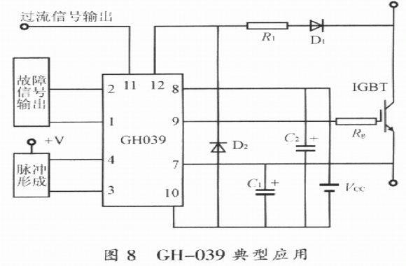 GH-039典型接線圖如圖8所示。工作電源VCC為26V;為了保持電壓穩(wěn)定,濾波電容器應(yīng)盡可能靠近GH一039模塊安裝和使用,且其電容值不能小于10μF,并應(yīng)選用高質(zhì)量的電容;串入GH-039腳12與ICBT集電極之間的二極管D1,應(yīng)選超快速恢復(fù)二極管,并且要保證其反向耐壓不低于ICBT的集電極與柵極之間的額定電壓;為防止所連接的過流保護(hù)端子光電隔離器的誤動(dòng)作,應(yīng)在D1與GH一039的腳12之間串入100Ω的電阻;接于腳lO與腳12之間的D2選用超快速恢復(fù)二極管,其反向耐壓可以低于IGBT的集射極間耐壓。