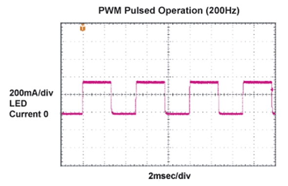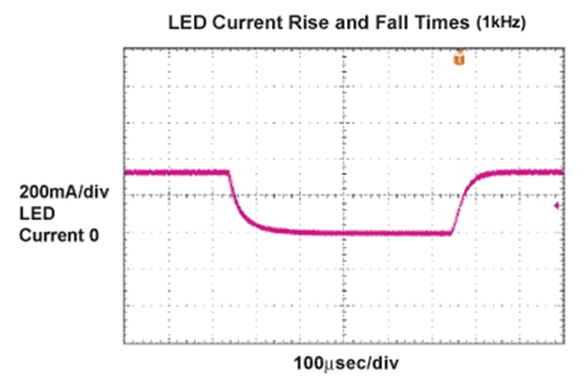 控制LED燈源亮度的最好辦法是通過一個低頻PWM脈沖調制LED電流。使用這種方法,LED電流根據占空比的變化觸發(fā)脈沖,同時保持電流幅度恒定。這樣,器件發(fā)出的光波波長在整個調節(jié)范圍內保持不變。