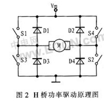 直流電機(jī)驅(qū)動使用最廣泛的就是H型全橋式電路,這種驅(qū)動電路方便地實(shí)現(xiàn)直流電機(jī)的四象限運(yùn)行,分別對應(yīng)正轉(zhuǎn)、正轉(zhuǎn)制動、反轉(zhuǎn)、反轉(zhuǎn)制動。H橋功率驅(qū)動原理圖如圖2所示。