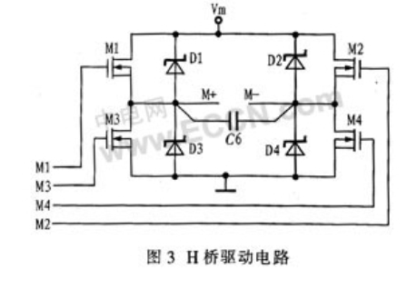相對來說,利用2個N溝道功率MOSFET和2個P溝道功率MOSFET驅(qū)動電機(jī)的方案,控制電路簡單、成本低。但由于加工工藝的原因,P溝道功率MOSFET的性能要比N溝道功率MOSFET的差,且驅(qū)動電流小,多用于功率較小的驅(qū)動電路中。而N溝道功率MOSFET,一方面載流子的遷移率較高、頻率響應(yīng)較好、跨導(dǎo)較大;另一方面能增大導(dǎo)通電流、減小導(dǎo)通電阻、降低成本,減小面積。綜合考慮系統(tǒng)功率、可靠性要求,以及N溝道功率MOSFET的優(yōu)點(diǎn),本設(shè)計(jì)采用4個相同的N溝道功率MOSFET的H橋電路,具備較好的性能和較高的可靠性,并具有較大的驅(qū)動電流。其電路圖如圖3所示。圖中Vm為電機(jī)電源電壓,4個二極管為續(xù)流二極管,輸出端并聯(lián)一只小電容C6,用于降低感性元件電機(jī)產(chǎn)生的尖峰電壓。