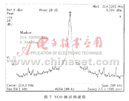 式中,fm為頻偏,KVCO為VCO控制靈敏度,fo為振蕩頻率,Q為品質(zhì)因數(shù),F為晶體管的噪聲系數(shù),K為波爾茲曼常數(shù),T為工作溫度,Ps為振蕩信號功率,fc為閃爍噪聲拐角頻率,Vm為低頻噪聲源的總幅度。從式(5)可以看出,選擇噪聲系數(shù)小的放大管、增加諧振回路有載Q值、減小VCO控制靈敏度、提高輸出信號功率都可以降低相位噪聲。通過減小變?nèi)莨茉谥C振回路中的接入系數(shù),可以有效減小VCO控制靈敏度,但是也會導(dǎo)致頻率覆蓋范圍的減小,所以要適當(dāng)選擇接入系數(shù)。該VCO輸出頻率為200MHz時,變?nèi)莨芙尤胂禂?shù)為0.63。通過適當(dāng)調(diào)整輸出回路的電感和分壓電容,可以提高負(fù)載阻抗,從而有效地提高輸出功率,以達(dá)到降低相位噪聲的目的。通過軟件仿真,在頻偏10kHz處的輸出相位噪聲為-101.3dBc/Hz,在100kHz處的相位噪聲為-122.5dBc/Hz。