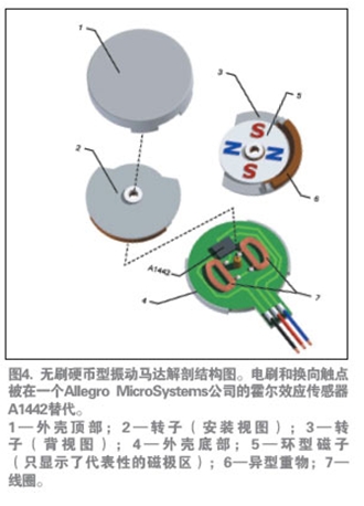 如前所述,無刷電機(jī)具有較長的壽命,并由于產(chǎn)生的電火花較少,也沒有了RFI干擾。無刷直流(BLDC)設(shè)計還提供業(yè)內(nèi)直徑最小、厚度最薄的扁平振動馬達(dá)。圖4介紹了這種馬達(dá)的基本構(gòu)造。