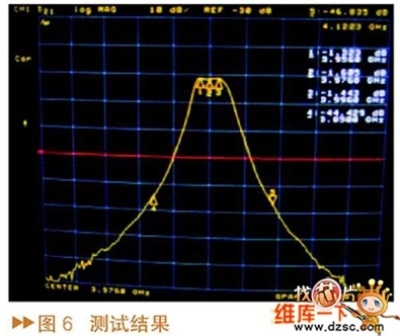 通過(guò)優(yōu)化得到濾波器的仿真結(jié)果如圖5所示,在仿真過(guò)程中為了提高仿真速度,全部的材料都設(shè)置成理想材料,所以仿真結(jié)果中濾波器插損為零。實(shí)際測(cè)試的濾波器的波形如圖6所示,可以看出,該方法設(shè)計(jì)的濾波器實(shí)際測(cè)試的結(jié)果與仿真的結(jié)果非常吻合,能夠達(dá)到指標(biāo)要求。
