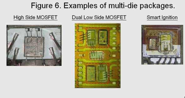 圖6所示為目前車載系統(tǒng)中采用多芯片封裝的幾個實例。這些智能化器件可以提供更高的系統(tǒng)性能監(jiān)控能力,通過集成保護功能提高功率系統(tǒng)的可靠性。如過流、過壓和過熱保護等功能都是這類產(chǎn)品的標(biāo)配。當(dāng)器件感測到有可能發(fā)生上述異常狀況時,能夠把功率MOSFET置于自我保護整個系統(tǒng)的環(huán)境中。此外,這些器件還集成有附加診斷功能,用以監(jiān)控負(fù)載開路或短路,有助于指導(dǎo)汽車機械裝置隔離和糾正車輛中出現(xiàn)的問題。