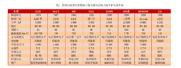 [page]20世紀(jì)70年代以來,電力電子學(xué)和微電子技術(shù)的出現(xiàn)和進(jìn)步,又重新喚起人們對交流傳動系統(tǒng)的熱情。自1971年世界首臺采用異步交流傳動系統(tǒng)的內(nèi)燃機車DE2500問世以來,交流傳動系統(tǒng)以其突出的優(yōu)越性受到了各國鐵路運輸部門的關(guān)注,獲得了長足的發(fā)展,并已基本取代了直流傳動系統(tǒng)。與直流傳動機車相比,交流傳動具有無可比擬的優(yōu)越性,這已經(jīng)在各國鐵路運輸系統(tǒng)中得到了廣泛的驗證。交流傳動所用的三相交流異步電動機比直流電動機的功率/體積比和功率/重量比更大,無需經(jīng)常維護,故障率低。異步電動機的恒功率區(qū)比直流電動機大許多,轉(zhuǎn)速更高,起動牽引力大,持續(xù)功率大,有利于實現(xiàn)重載和高速牽引。交流傳動可以很容易地實現(xiàn)電氣制動,大大減少制動閘瓦的消耗,并可以利用制動時反饋的能量,起到節(jié)能節(jié)油的作用,經(jīng)濟效益顯著。另外,交流傳動機車的一個突出的優(yōu)點在于其優(yōu)良的粘著特性,由于異步交流電動機變頻調(diào)速系統(tǒng)具有很硬的機械特性,車輪更不容易打滑或者空轉(zhuǎn)。其次,交流傳動電力機車牽引和再生工況的功率因數(shù)均接近于1,不僅降低了電網(wǎng)損耗而且在再生制動時可將高質(zhì)量電能反饋給電網(wǎng),消除了電網(wǎng)對信號和通信系統(tǒng)的干擾。再者,機車采用交流牽引電動機后,簧下重量大大減輕,改善了輪軌動力學(xué)性能,降低了機車輪緣磨耗。隨著磁場定向矢量控制和直接轉(zhuǎn)矩控制等高性能異步電動機控制策略的應(yīng)用,交流傳動機車的調(diào)速性能已經(jīng)能夠達(dá)到甚至超過直流傳動機車。表1是國外比較有代表性的使用交流傳動的電力機車和電動車組。