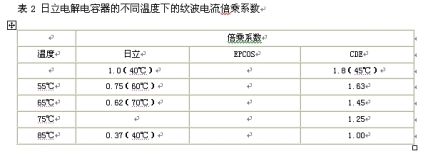 電解電容器的主要參數(shù)在不同溫度下的紋波電流倍乘系數(shù)如表2
