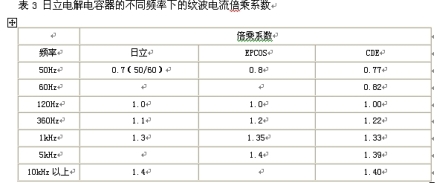 電解電容器的主要參數(shù)在不同頻率下的紋波電流倍乘系數(shù)如表3