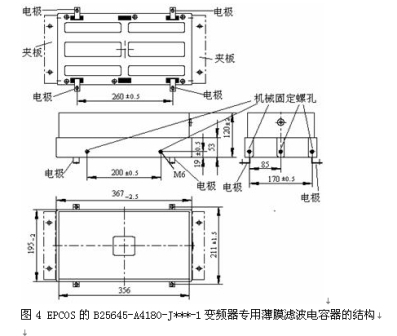 以EPCOS的B25645-A4180-J***-1變頻器專(zhuān)用薄膜濾波電容器的結(jié)構(gòu)為例,如圖4。電容器的引出端為銅板,裝配方式可以是將電極用螺栓固定在直流母線板的正、負(fù)極,實(shí)現(xiàn)電氣連接,這樣的電氣連接電容器與直流母線所包圍的空間將非常小,因而所產(chǎn)生的寄生電感也將非常小。再用L型固定夾板將電容器模塊固定在散熱器上,完成電容器模塊的機(jī)械固定,如圖3的安裝方式 。