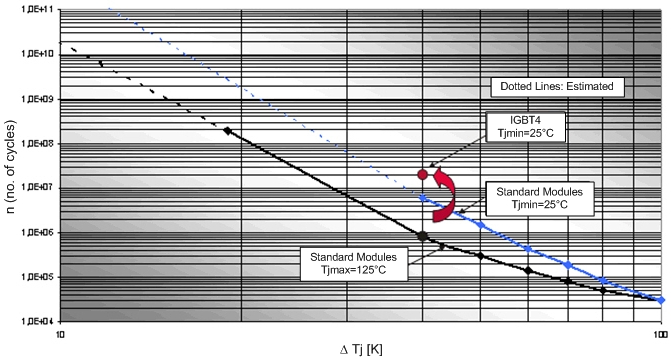 圖 1: 在接通時(shí)間約為1秒和電流約為標(biāo)稱(chēng)電流條件下,1200V標(biāo)準(zhǔn)模塊使用壽命圖和EconoPACK模塊的典型使用壽命