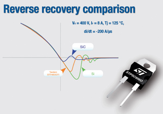 像STPSC806D和STPS1006D 這類碳化硅二極管給開(kāi)關(guān)式電源(SMPS)設(shè)計(jì)人員帶來(lái)的另一個(gè)好處是,可以提高開(kāi)關(guān)頻率,使其它元器件如濾波電容和電感變得更小,成本更低廉,功耗更低。